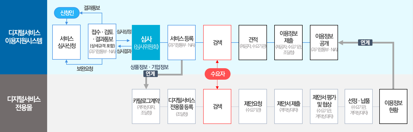 ※ 수요기관이 이용지원시스템에서 검색 후 공급업체와 직접 계약하거나, 디지털서비스몰을 통해 구매 요청 모두 가능