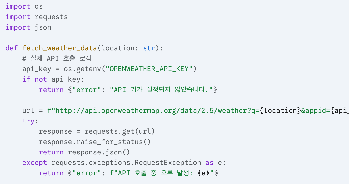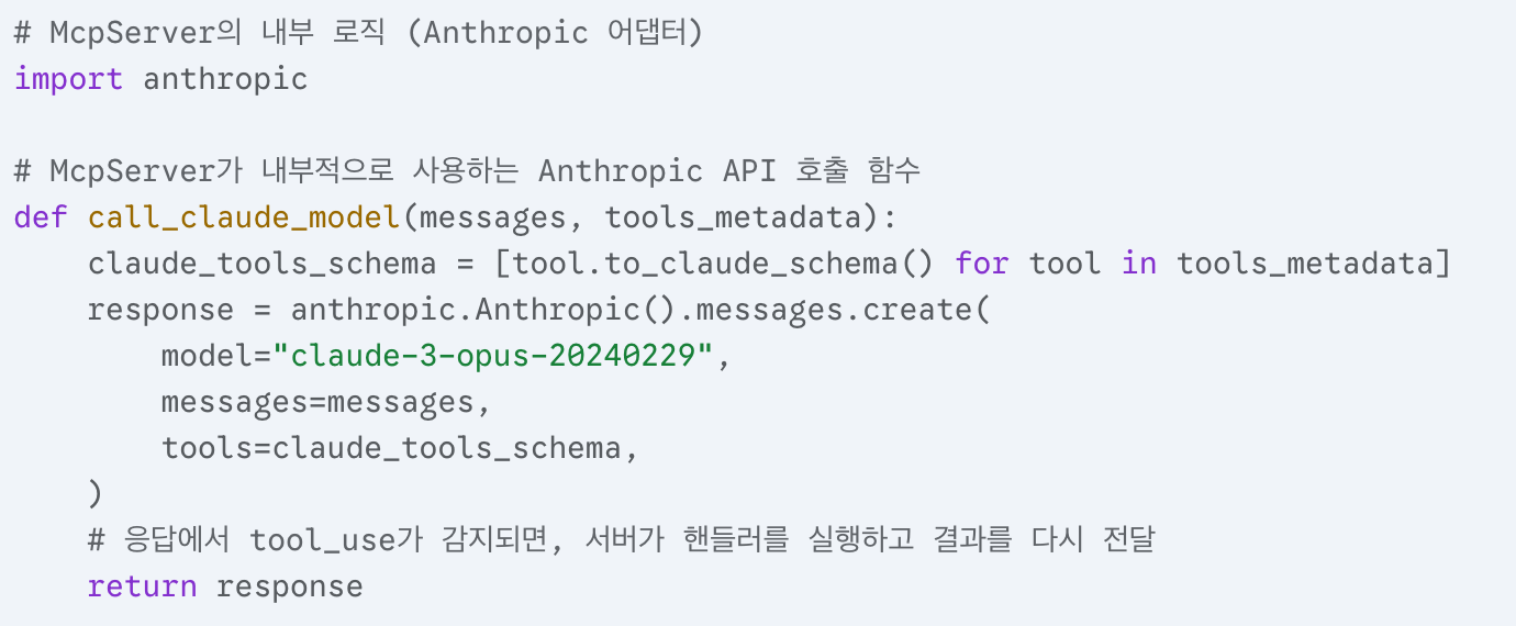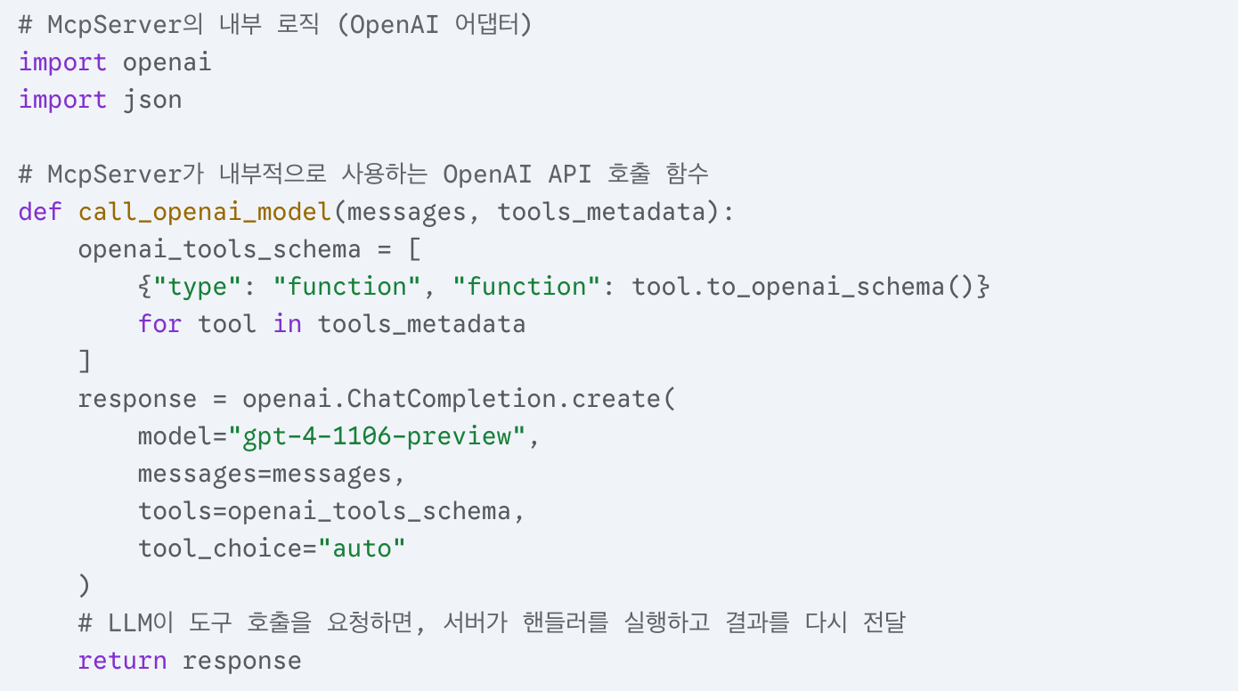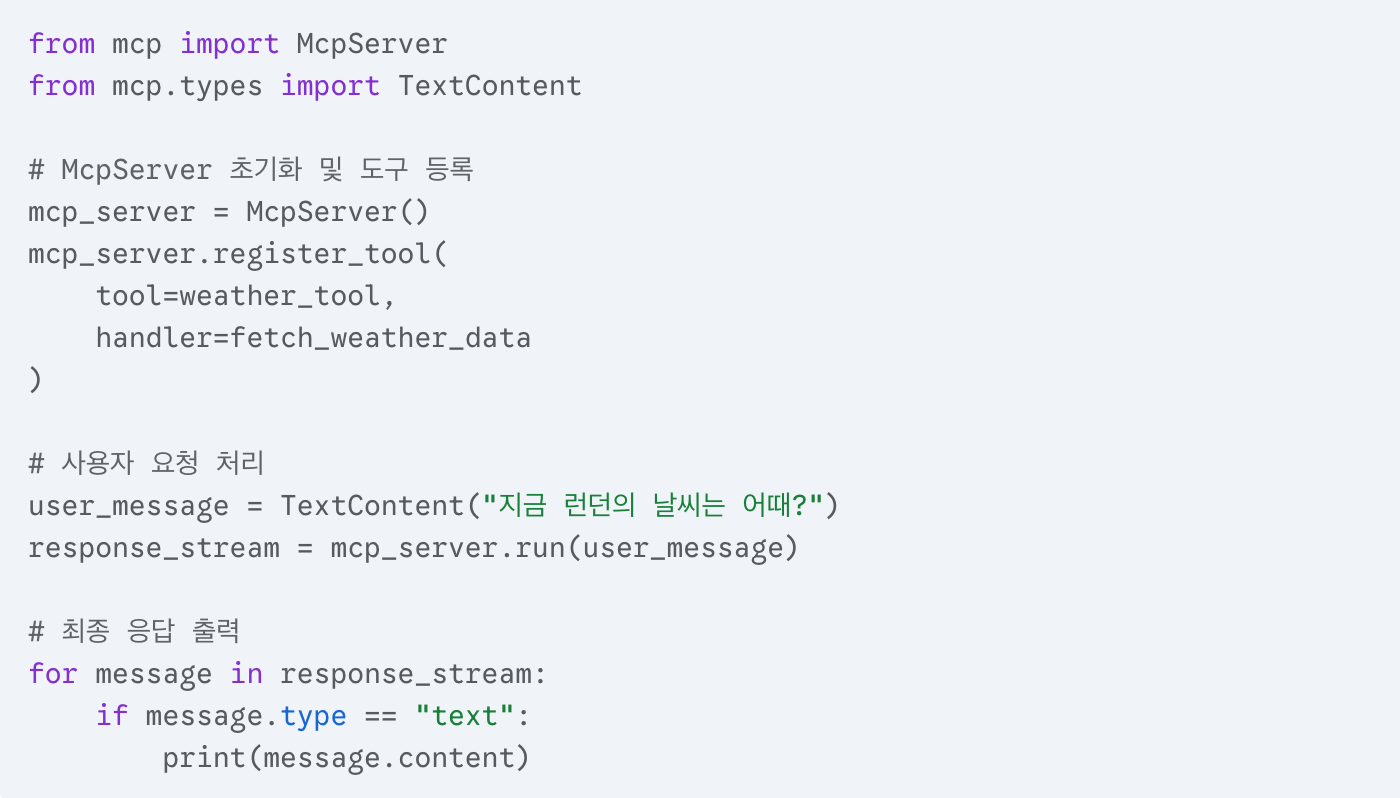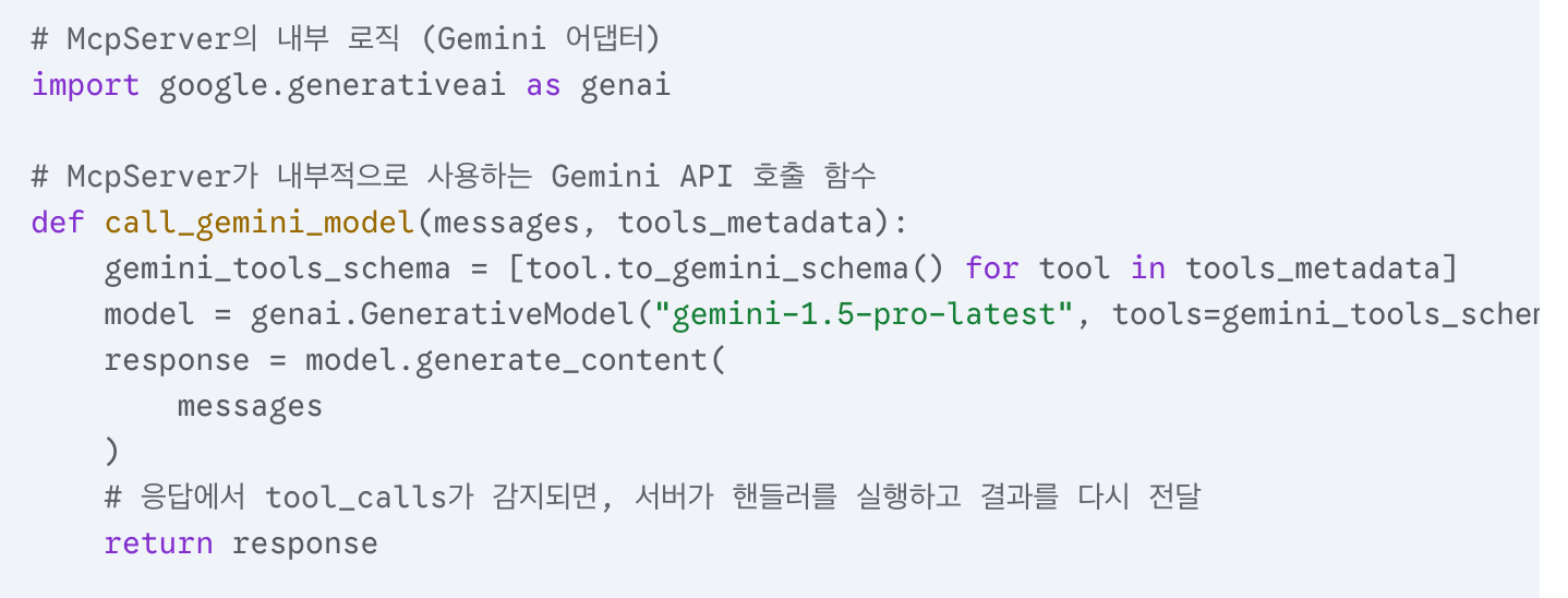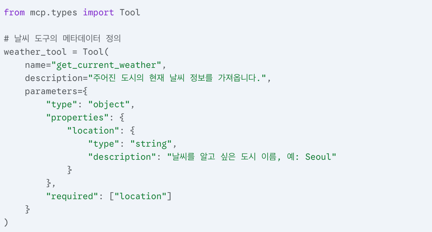 이러한 mcp는 기업이 특정 llm에 종속되는 이슈를 완화하면서 서비스의 확장성 및 유연성을 극대화하는 솔루션을 가능하게 한다. mcp를 활용한 서비스 구현: 날씨 서비스 mcp의 작동 원리를 이해하기 위해 실제 코드들로 날씨 서비스를 구현해 본다. 이 서비스는 llm이 사용자의 요청을 분석하여 실제 날씨 정보를 제공하는 외부 api를 호출하고, 그 결과를 바탕으로 응답을 생성한다. 도구(tool) 정의와 핸들러 구현 파이썬으로 구현하는 예제에서는 mcp 프레임워크를 사용한다. 이를 사용하면, 도구의 메타데이터와 실제 로직을 분리하여 관리할 수 있는데, 여기서 도구 메타데이터는 llm에게 전달되는 정보로, 도구의 이름과 설명, 필요한 매개변수를 정의한다. 자세하게 적을수록 정확한 때 도구가 불리고, llm이 이후에 입력 변수들을 채우는 데 쓰인다. 그림 2 날씨 도구의 메타데이터 정의 실제 외부 api(openweathermap)를 호출하여 데이터를 가져오는 함수를 작성한다. 이 함수는 llm이 직접 호출하는 것이 아니라, 조건이 만족되었을 때 mcp 서버가 호출한다. 그림 3 open weathermap을 호출하는 날씨 도구의 구현 예제 mcpserver에 도구 등록 및 실행 mcpserver는 도구의 메타데이터와 핸들러를 연결하고, 사용자 요청부터 최종 응답까지의 전체 과정을 관리하는 역할을 한다. 그림 4 mcpserver 등록 및 실행 예 각 llm별 통합 예제 mcpserver는 내부적으로 각 llm 공급자의 api에 맞춰 tool 객체와 핸들러를 변환하는 어댑터 패턴을 사용한다. 개발자는 아래와 같은 내부 구현을 신경 쓸 필요 없이, 동일한 register_tool() 인터페이스를 사용하면 된다. openai llm openai는 tools 매개변수를 사용해 함수 호출 정보를 받는다. mcpserver는 등록된 도구 메타데이터를 오픈ai의 json 스키마 형식으로 변환하여 요청에 포함한다. 그림 5 오픈ai에서 호출하는 mcpserver 등록 및 실행 예 anthropic api (tool use) 앤스로픽은 'tool use' 기능을 통해 유사한 스키마를 사용한다. mcpserver는 tool 객체를 클로드 api의 tools 매개변수에 맞는 형식으로 변환한다. 그림 6 앤스로픽에서 호출하는 mcpserver 등록 및 실행 예 gemini api (function calling) 제미나이는 'function calling' 기능을 지원한다. mcpserver는 tool 객체를 gemini.generativemodel 의 tools 매개변수에 전달할 수 있는 functiondeclaration 객체로 변환한다. 그림 7 google gemini api에서 호출하는 mcpserver 등록 및 실행 예 주의할 점들 llm과 mcp를 활용하여 서비스를 개발할 때는 몇 가지 중요한 고려 사항이 있다. 이 점들을 간과하면 예측하지 못한 오류나 보안 문제가 발생할 수 있다. 아래의 주의 사항들을 잘 따르면, llm과 mcp를 활용한 서비스의 안정성, 신뢰성, 그리고 사용자 만족도를 크게 높일 수 있다.