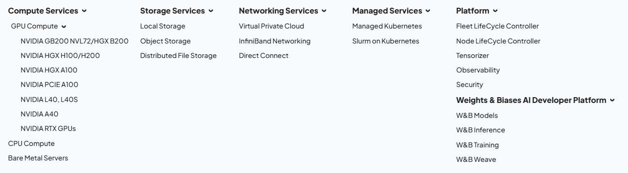 네트워크 기술은 고성능의 서비스를 효과적으로 고객에게 클라우드 환경에서도 온-프레미스와 동일하게 제공하도록 하는 것에 방점이 있다면 소프트웨어 기술은 편의성과 이식성, 그리고 네오클라우드 기업 입장에서 자원을 최대한 효율화함으로써 원가를 절감하고 한편 고객에게도 저렴하고 유연한 가격 정책을 제공할 수 있다는 데 의미가 있다. 3. 주요 네오클라우드 기업 동향 앞서 언급한 주요 네오클라우드 기업인 코어위브, 람다, 크루소, 네비우스 동향은 다음과 같다.