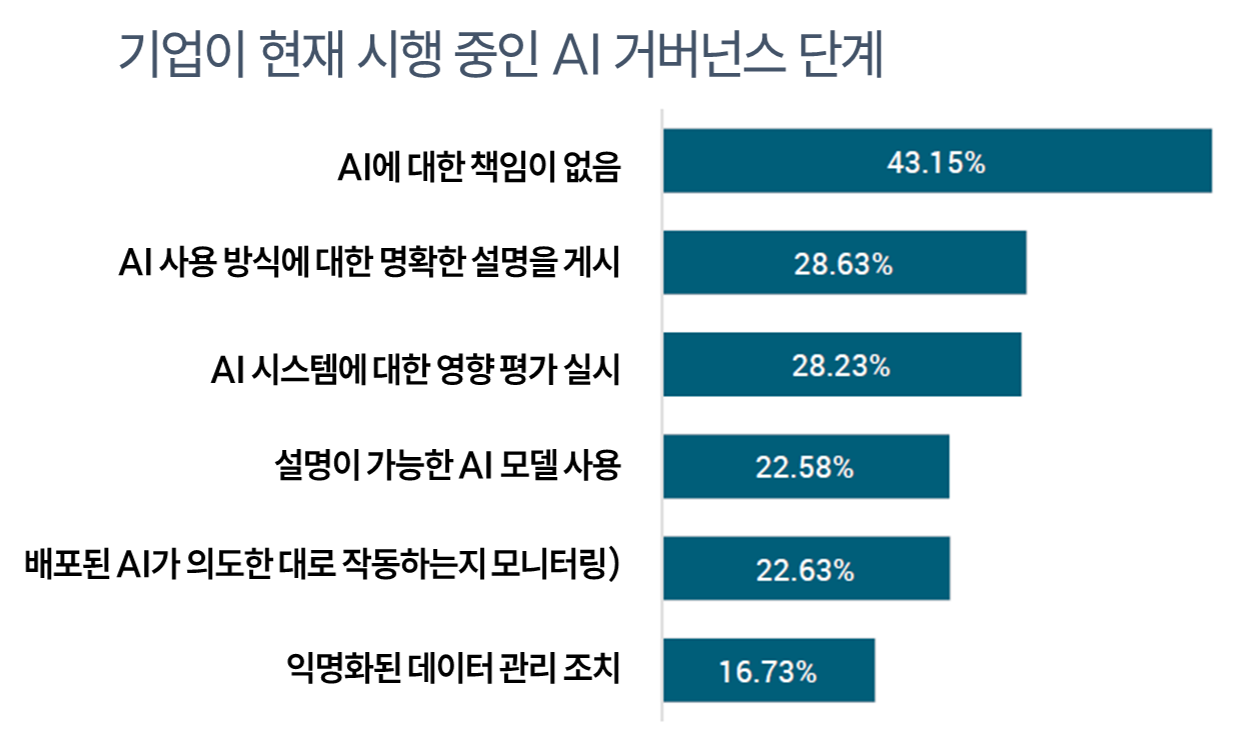 2. AI 기반 위협에 대한 보안 AI가 빠르게 발전함에 따라 기업은 기술 도입의 이점과 잠재적 위험성을 모두 이해하고 있다. 이러한 이해는 정부에서 안전하고 신뢰할 수 있는 AI 사용을 의무화하고 있는 시점과 맞물려 있다. 기술의 잠재적 영향과 관련된 다양한 이해관계자를 이해하는 것 외에도 AI 라이프사이클 전반에 걸쳐 보안을 강화하여 이러한 기술을 효율적으로 사용하는 동시에 AI 기반 위협으로부터 보호할 수 있도록 하는 것이 중요하다. 조직이 AI 여정을 시작할 때 가장 먼저 집중해야 할 이니셔티브 중 하나는 AI 전략과 거버넌스를 개발하고 비즈니스 목표와의 연계성을 명확히 하는 것이다. 인력, 프로세스, 기술 및 보안에 미치는 영향을 포함하는 정의된 로드맵을 마련하면 책임감 있는 AI를 구축하기 위한 프레임워크를 개발할 수 있다. 이를 통해 AI 기술을 채택하는 조직은 활용하는 기술이 비즈니스 목표를 지원하고 있는지 확인하고 기술 사용의 윤리적 문제와 위험 영향을 평가할 수 있는 구조를 갖출 수 있다. 또한 다양한 AI 기술의 등장으로 조직은 비즈니스에 도움이 될 기술을 도입할 수 있는 능력을 평가할 수 있게 되었다. 인포테크의 조사에 따르면, 55%의 조직이 위험을 식별하고 전반적인 보안 태세를 개선하기 위해 이미 AI를 활용하고 있거나 2024년에 AI를 사용할 계획이다. 많은 조직이 AI의 힘을 활용하기 위해 노력하고 있는 만큼, 기술을 효과적으로 도입하기 위한 조치가 마련되어야 한다. 따라서 강력하고 윤리적인 리스크 관리 프레임워크를 마련하기 위해 AI 거버넌스를 수립하는 것은 조직의 AI 로드맵에서 가장 먼저 시작해야 할 과제 중 하나이다. 조직의 40% 이상이 아직 AI 거버넌스를 구축하지 않았다고 응답한 만큼, 조직 내에서 AI를 관리, 모니터링 및 제어할 수 있는 기반을 구축하는 것부터 시작해야 비즈니스 내에서 AI를 개발하고 확장할 수 있는 잠재력이 생긴다. AI 위험 관리 프레임워크를 구현하면 AI 시스템에 대한 충분한 감독을 보장하고 AI의 사용 제안에 효과적으로 도전할 수 있다. 또한 이 프레임워크는 수명 주기 전반에 걸쳐 위험을 평가하고 평가와 감사를 통해 생산 과정을 모니터링 할 수 있도록 보장한다. 업무에 AI를 적용하기 전에 이러한 구조를 갖추면 급격한 변화 속에서 조직을 보호하는 동시에 경쟁 우위를 위해 정의한 프로세스가 포함된 견고한 방법론을 만들 수 있다. 그림 3 기업의 현재 AI 거버넌스 단계 (출처: Info-Tech) 드라이버
