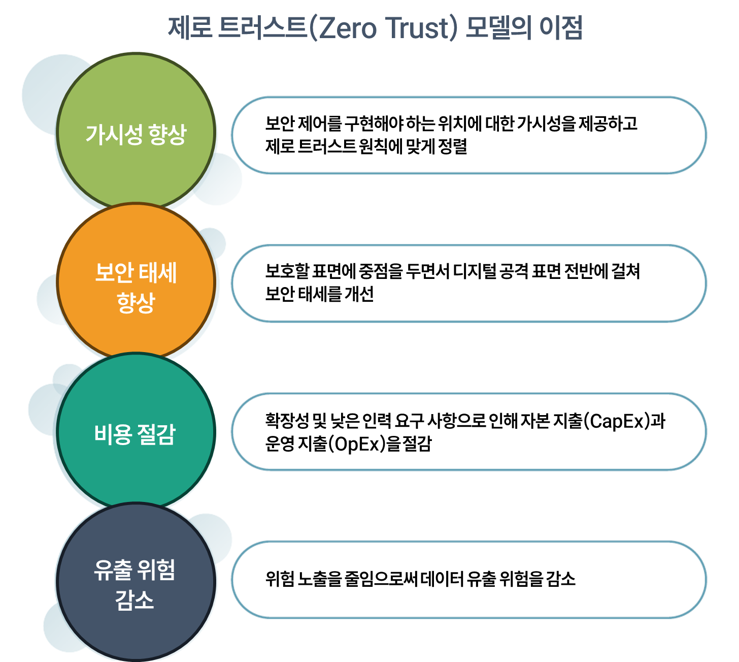 3. 제로 트러스트 (Zero Trust) 전략 운영 공격 기법과 해킹 기술의 발전으로 정교한 공격이 증가함에 따라 조직은 가장 중요한 자산을 보호하기 위해 다양한 전략을 수립하고 있다. 제로 트러스트를 도입하면 조직의 보안 태세를 개선하고 비즈니스 목표를 지원할 수 있는데, 해킹을 노리는 공격자가 IT 환경에서 우회 침투할 수 있는 능력을 줄이고, 중요 리소스에 최소 권한 액세스를 적용함으로, 공격으로 피해를 입을 표면을 최소화하는데 도움이 된다. 또한, 조직의 위험과 규정 준수 비용을 줄임으로써 전략을 실행하는 데 필요한 최소한의 이점을 보장할 수 있다. 그러나 다른 중요한 보안 권장 사항과 마찬가지로 전략 실행을 위한 로드맵을 구축하여 진행 상황을 검토하고 지속적인 개선 기회를 파악할 수 있는 프로세스를 마련하는 것이 필수적이다. 많은 조직이 클라우드 환경으로 전환함에 따라 해킹하는 공격자들은 클라우드 기반 환경을 목표로 위협 범위를 확장하고 있다. 크라우드스트라이크의 보고서에 의하면, 사고 탐지의 70% 이상이 멀웨어가 없는 활동에서 발생했다. 이렇게 전통적인 멀웨어 기반 공격이 감소하고 있는 이유는 해킹이 줄었다는 뜻이 아닌 악성 해커가 조직의 네트워크 자산에 침투하기 위해 사용하는 방법이 더욱 다양하고 정교해지고 있음을 의미한다. 제로 트러스트 로드맵을 구축할 때는 구현 중인 이니셔티브가 반복 가능한 프로세스를 통해 발전해야 한다는 점을 이해해야 한다. 이렇게 하면 가장 중요한 보호 영역부터 우선순위를 정할 수 있으므로 지속적인 개선과 효율적인 배포를 보장할 수 있다. 또한 최소 권한 및 요청 유형별 액세스 시행과 같은 일련의 원칙을 구현하면 중요 자산에 대한 손상을 최소화하여 조직의 위험과 비용을 줄이고 규제 표준을 준수할 수 있다. 이를 통해 조직은 경쟁력을 유지하고 위험 노출을 줄이면서 비즈니스 이점을 극대화할 수 있다. 로드맵을 구축하려면 조직의 목표와 제로 트러스트 전략을 구현하는 것이 조직의 목표 달성을 어떻게 지원하는지 파악하는 것부터 시작해야 한다. 여기에는 데이터, 자산, 애플리케이션, 서비스 요소(DAAS: Data, Assets, Applications, Services)를 포함하는 중요한 보호 영역을 정의하는 것으로 부터 시작된다. 보호 대상과 조직의 목표를 정의함으로써 로드맵을 효과적으로 설계하고 전략의 구현을 개발 및 모니터링하며 원하는 결과에 접근한다. 위협 환경의 변화는 제로 트러스트 전략을 채택하고 '언제' 구현해야 하는지에 대한 사고방식에서 '어떻게' 시작할 수 있는지에 대한 사고방식의 전환 필요성을 말해준다. 제로 트러스트 단계별 도입 로드맵은 조직이 효과적이고 측정 가능하며 반복적인 전략을 개발하여 보안 의식과 조직의 성공 지표를 연결하여 지속적으로 개선하는 데 도움이 된다. 그림 4 제로 트러스트 모델 이점 드라이버