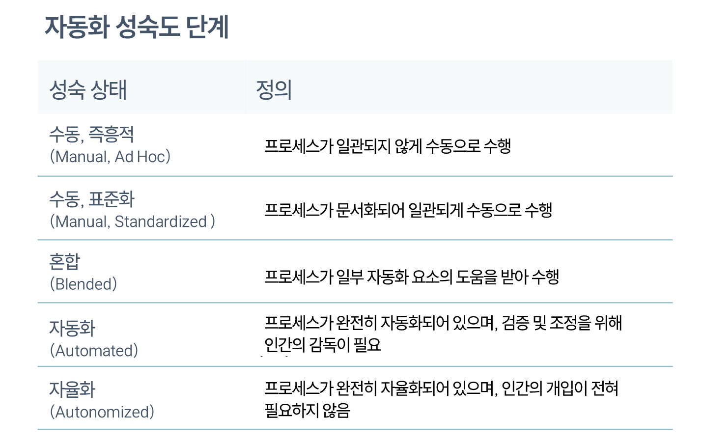 AI 기반 위협이 증가함에 따라 보안 자동화 및 자율화에 대한 필요성은 더욱 높아진다. 자동화 이니셔티브를 시작하려면 자동화 목표와 조직에 대한 가치, 그리고 이러한 목표를 달성하기 위한 전략을 파악하기 위한 로드맵 개발이 필요하다. 이런 로드맵이 실행되는 안정된 조직 구조를 갖추면 자동화 목표를 달성하는 데 적합한 인력, 프로세스와 기술 확보를 위한 정당성이 생긴다. IBM의 조사에 따르면, 61%의 조직이 일정 수준의 보안 AI 및 자동화를 도입하여 150만 달러 이상의 비용 절감 효과를 거두었다고 한다. 하지만, 이미 간소화된 프로세스를 갖추고, 관련된 잠재적 위험이 적은 경우엔 모든 보안 프로세스를 자동화하거나 자율화할 필요는 없다. 조직의 요구사항과 보안 성숙도를 평가하면 보안 프로세스의 효율성, 생산성 및 품질을 개선하면서 가장 큰 가치를 제공할 수 있는 자동화 이니셔티브를 파악할 수 있다. 이런 투자는 수작업의 감소와 사이버 공격의 방어로 발생하는 비용의 감소를 통해 지속 가능한 투자 수익을 제공한다는 점에서 장기적인 비용 절감 효과가 있다. 업무 효율성이 경쟁력을 나타내는 오늘날, 자동화는 효율성을 개선하는 동시에 지속적인 개선을 가능하게 하는 접근 방식이다. 향상된 경고/경보 분류를 통해 제공되는 향상된 보호 기능과 규정 준수 결함 감소 및 비용 효율성 향상은 진화하는 위협 환경에 많은 이점을 준다. 조직의 현재 보안 상태를 평가, 파악하여 자동화를 통해 간소화할 수 있는 프로세스를 정의하는 것이 중요하다. 문서화를 통해 프로세스를 표준화하고 이러한 변화에 필요한 리소스 할당을 위한 타당성 평가를 수행한 후, 조직이 보안 프로세스 전반에 걸쳐 자동화를 달성하여 보안 운영을 개선할 수 있도록 한다. 자동화 로드맵은 프로세스를 자동화할 때 나타다는 새로운 도전과 기회가 동시에 발생할 수 있는 진행 과정이다. 각 프로세스 내에서 지속적인 개선을 보장하면 자동화 로드맵을 효율적으로 구현할 수 있으며, 이를 통해 보다 적합하고 위험 부담이 적고 실현 가능한 전략을 수립할 수 있다. 그림 5 자동화 성숙도 단계 (출처: 인포테크) 드라이버