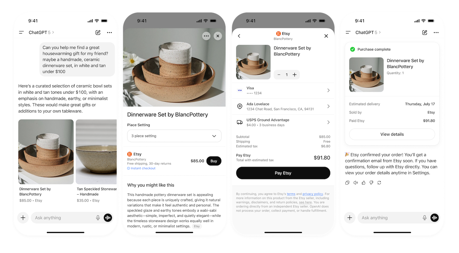 이러한 한계를 극복하고 자연어로 명령하면 결제까지 끝나는 세상을 만들기 위해 등장한 것이 바로 오픈AI+스트라이프의 ACP와 구글의 AP2이다. 오픈AI + 스트라이프: ACP(Agentic Commerce Protocol)의 등장 그림 2 ChatGPT 인스턴트 체크아웃 예제2) 오픈AI와 스트라이프가 협력하여 제시하는 ACP는 에이전트 AI가 인터넷 상거래를 수행하는 방식을 근본적으로 재정의하려는 시도이다. 이는 단순한 결제 기능 추가가 아니라, 에이전트와 상점이 서로 소통할 수 있는 새로운 언어를 만드는 작업이다. 현재의 인터넷은 사람을 위해 설계되어 있어서 쇼핑몰마다 상품을 보여주는 방식, 장바구니에 담는 버튼의 위치, 결제창의 구조가 모두 다른데, 사람은 이 차이를 눈으로 보고 직관적으로 이해하지만, AI 에이전트에게는 매번 새로운 학습이 필요한 거대한 장벽이다. 이를 해결하기 위해 ACP는 에이전트가 여러 상점과 대화하며 상품 검색 → 가격·옵션 협상 → 주문 확정으로 이어지는 일련의 과정을 표준화한다. ACP를 도입한 상점이라면 어떤 AI 에이전트와도 막힘없이 거래를 시작할 수 있게 된다. 기술적으로 ACP는 에이전트가 읽고 쓰기 쉬운 JSON 기반의 REST API 형태로 구현된다. 핵심은 거래의 단계를 명확한 '자원'과 '상태'로 정의하고 있다는 점이다.